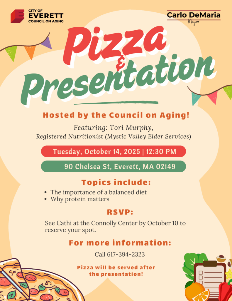 For additional information, please call 311 or 617-394-2270 to be connected to the Connolly Center. This event is sponsored by the Everett Foundation for Aged Persons.